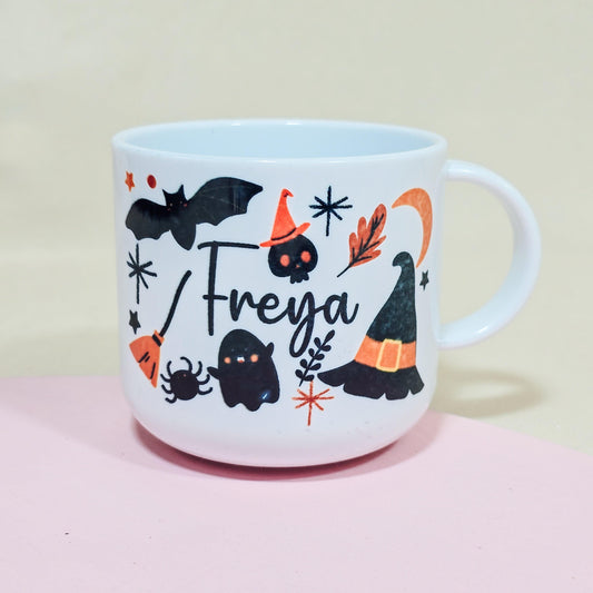 Personalised Halloween Mini Mug - Personalised Halloween Mug for Kids – Unbreakable 6oz Cup with Name - Bats, Witches, & Pumpkins Design