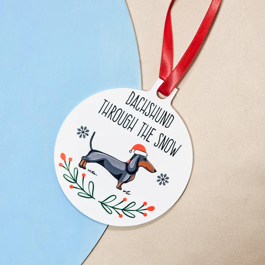 Personalised Dachshund Christmas Bauble - Dachshund Through the Snow - Santa Hat Ornament for Dog Lovers - Custom Pet Gift