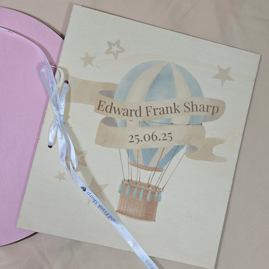 Personalised Newborn Baby Card Book | Hot Air Balloon Design | Pink or Blue | Baby Memory Book | Name & Date of Birth Keepsake Folder