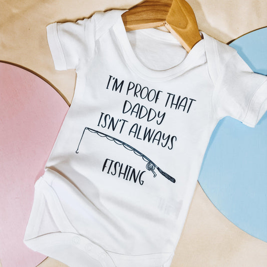 Personalised Baby Vest – "I'm Proof Daddy Isn't Always Fishing" – Custom Fishing Baby Gift – Funny Baby Bodysuit – New Baby Outfit