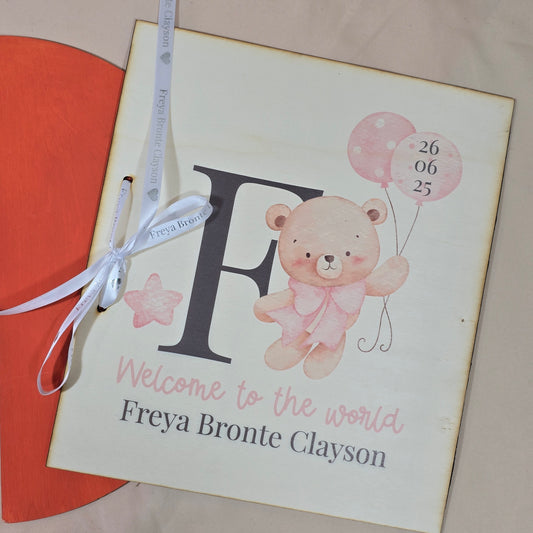 Personalised Wooden Baby Memory Book – Welcome to the World | Bear & Balloon Design | Name Date of Birth | Pink or Blue | Newborn Keepsake
