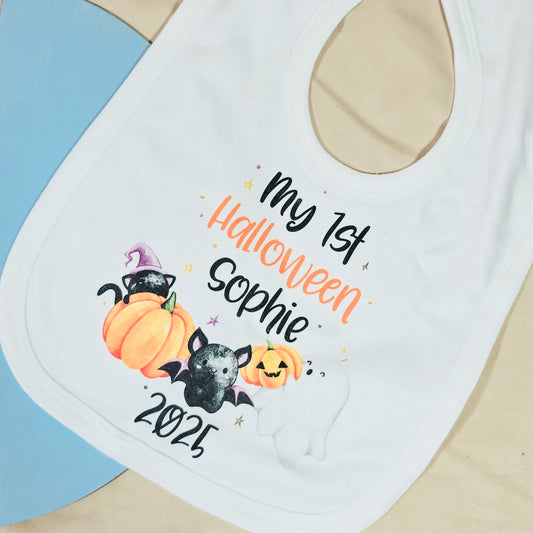 Personalised 1st Halloween Baby Bib | Custom Name & Year | Baby’s First Halloween Gift | Pumpkin Bib