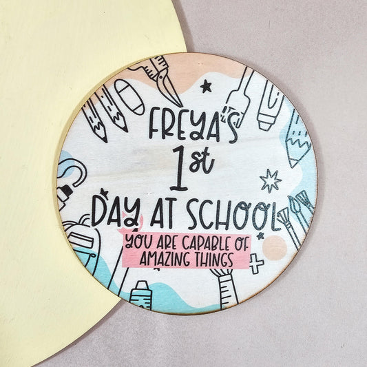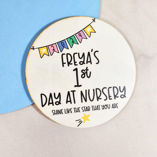Personalised First Day at Nursery Sign - Custom Name Wooden Photo Prop - Shine Like a Star - Colourful Bunting and Shooting Star Design