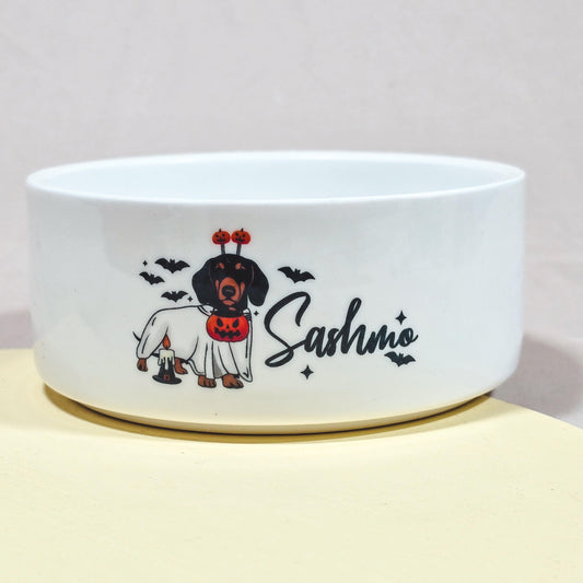 Personalised Halloween Dog Bowl - Halloween Dachshund Design - Custom Sausage Dog Pet Bowl - Halloween Lover - Halloweenie