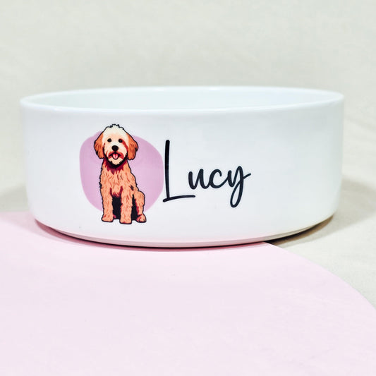 Personalised Cockerpoo Bowl - Custom Dog Bowl - New Puppy Gift - Ceramic Dog Bowl with Pink Background
