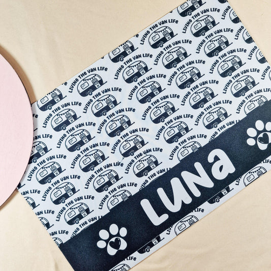 Personalised Van Life Pet Mat - Custom Caravan Design with Name - Non-Slip Pet Mat - Travel Themed Pet Accessory - Custom Pet Feeding Mat