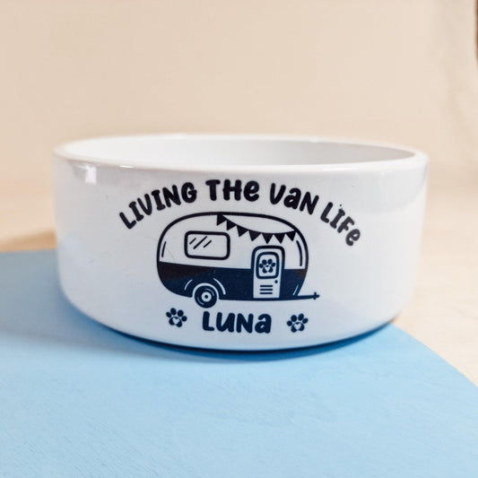 Personalised Caravan Pet Bowl - Custom Dog Bowl with "Living the Van Life" - Travel Themed Pet Dish - Custom Pet Bowl for Van Lovers